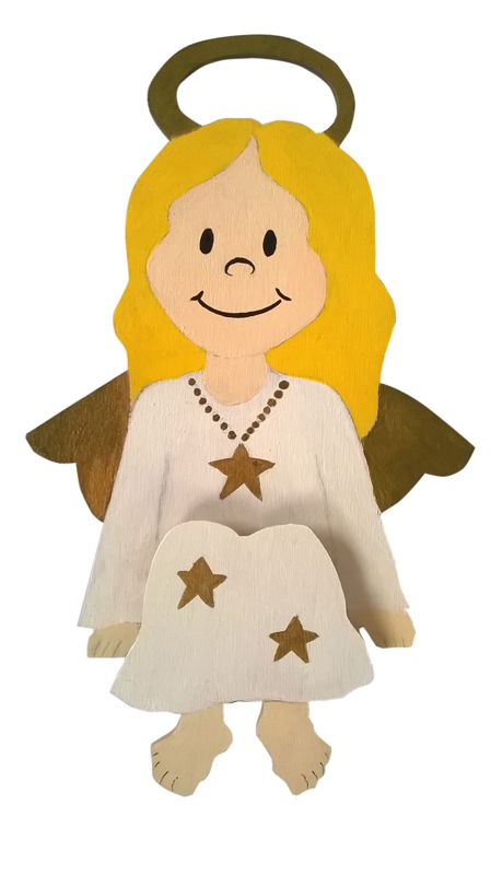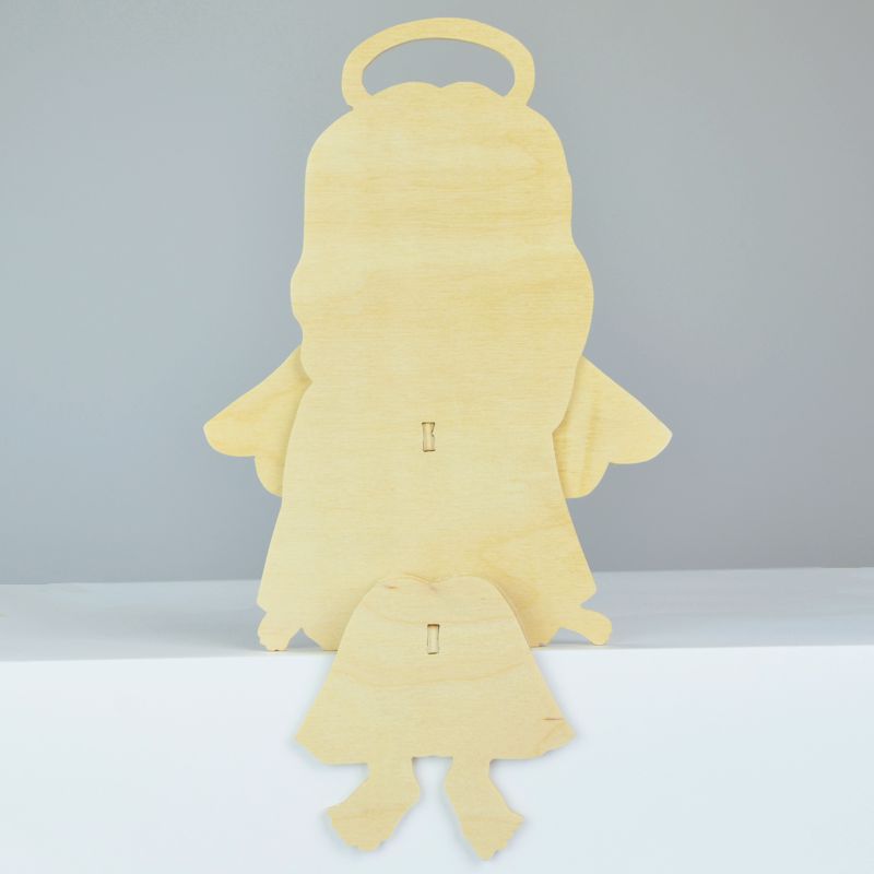 Der Holzbausatz Kantenhocker Engel besteht aus einer vorgestanzten Holzplatte. Die vorgestanzten Bauteile werden einfach aus der Holzplatte herausgedrückt, entgratet, zusammengesteckt und mit ein paar Tropfen Leim fixiert.
