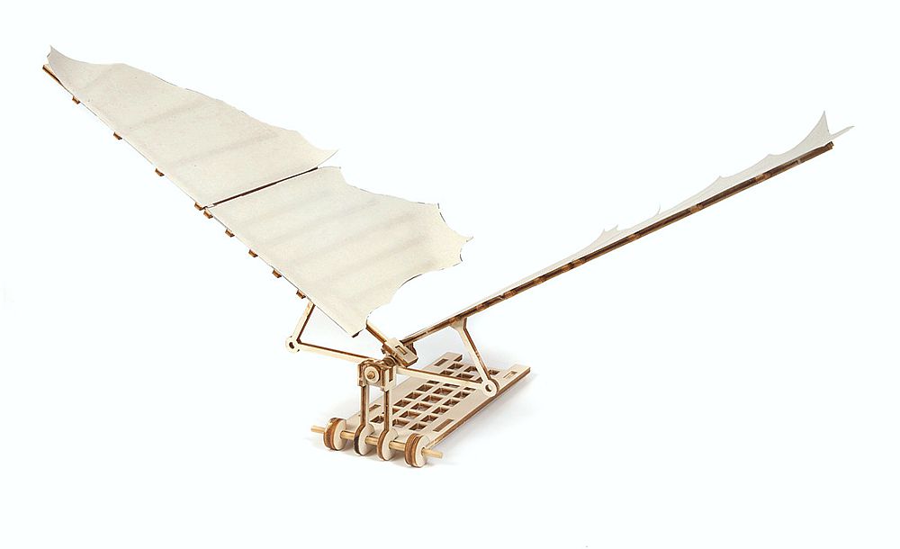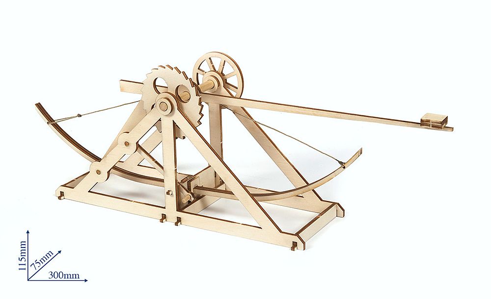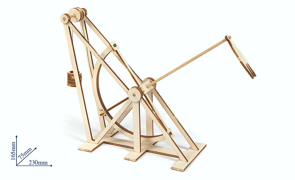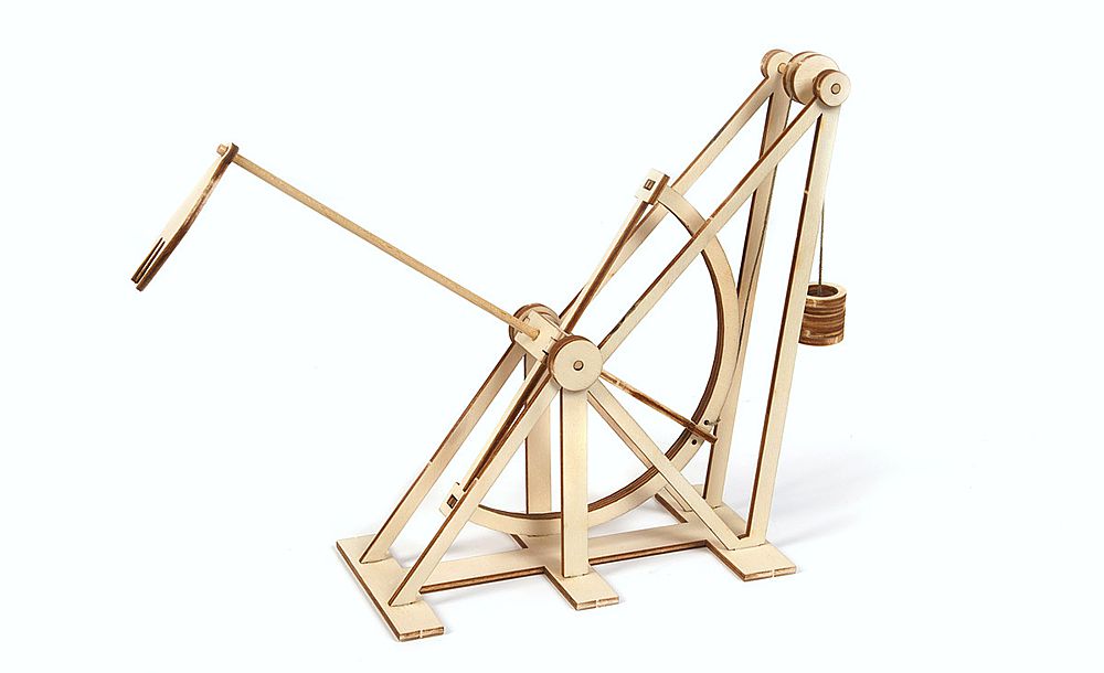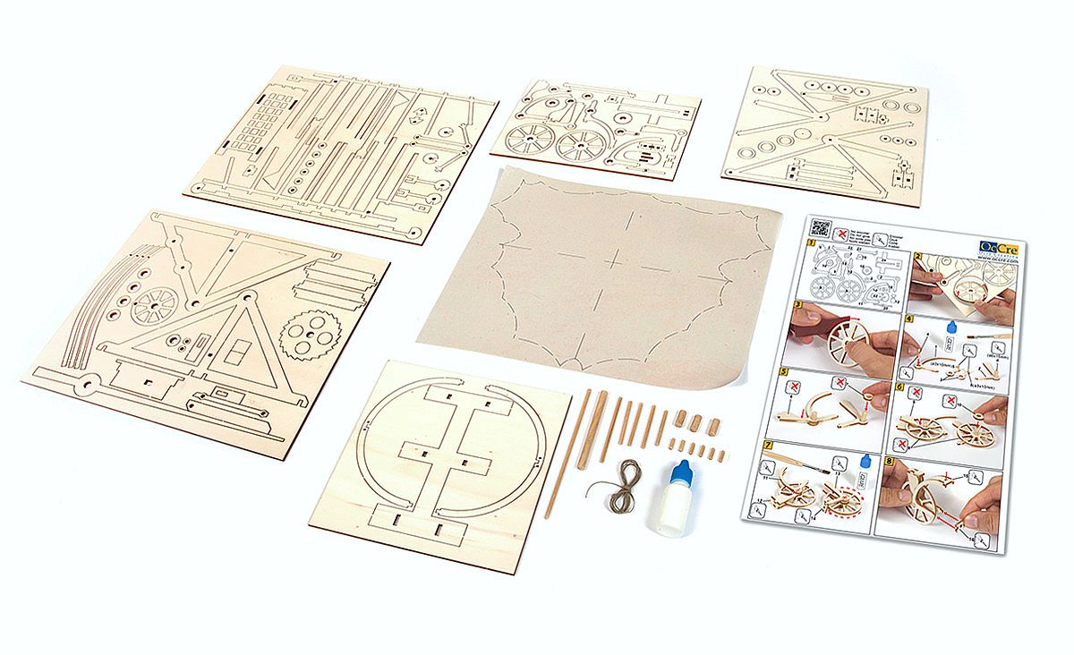 Holzbausatz im 4er Set mit vier Nachbildungen von Maschinen die von Leonardo Da Vinci bekannt sind. Per lasercut präzise vorgefertigt, lassen sich die 4 Modelle einfach zusammenbauen.