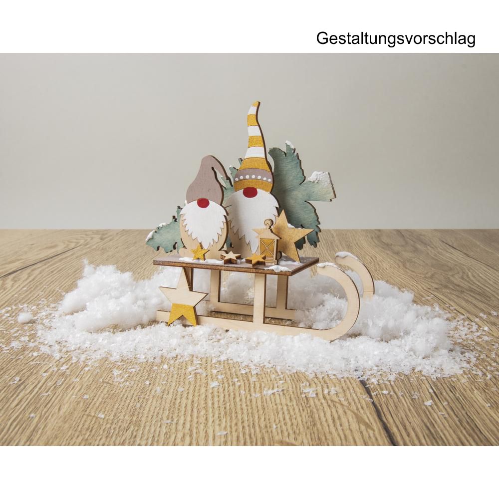 Weihnachtlicher Holzschlitten mit niedlichen Wichtelmännchen. Zusammenstecken und bemalen, fertig ist eine kleine Wichtelszene als Weihnachtsdeko.