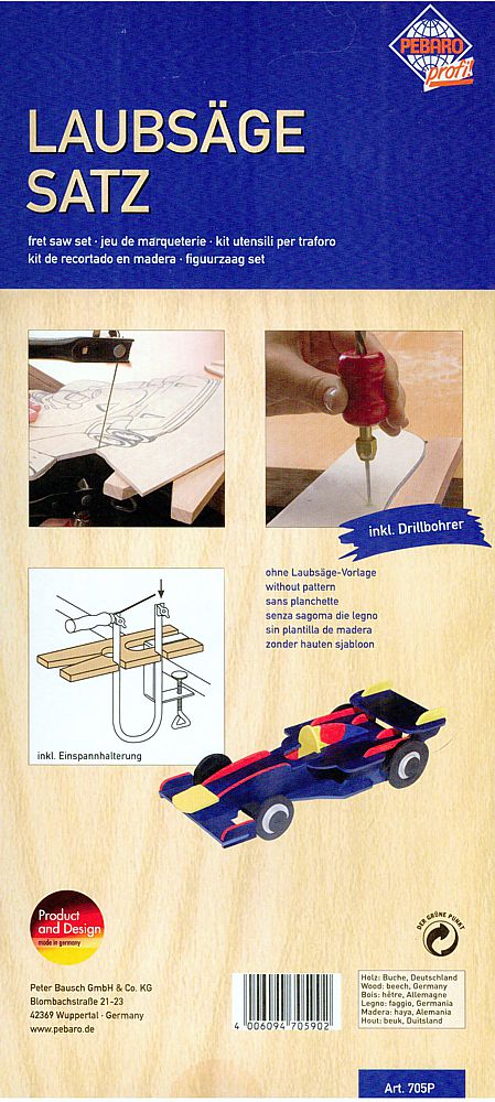 Pebaro Laubsäge-Starterset für die ersten Versuche mit der Laubsäge. Zum Lieferumfang gehört die Laubsäge, ein Drillbohrer, ein Laubsägebrettchen und die passende kleine Schraubzwinge. Mit der Schraubzwinge und dem Laubsägebrettchen wird das Werkstück an einer Tischplatte oder einer Werkbank festgespannt. Fall du in den Innenräumen deiner Vorlage schneiden willst, dann benutze den Drillbohrer. Bohre ein Loch und dann kannst du das Sägeblatt durch das zu sägende Werkstück spannen und dann die gewünschte Öffnung aussägen.
