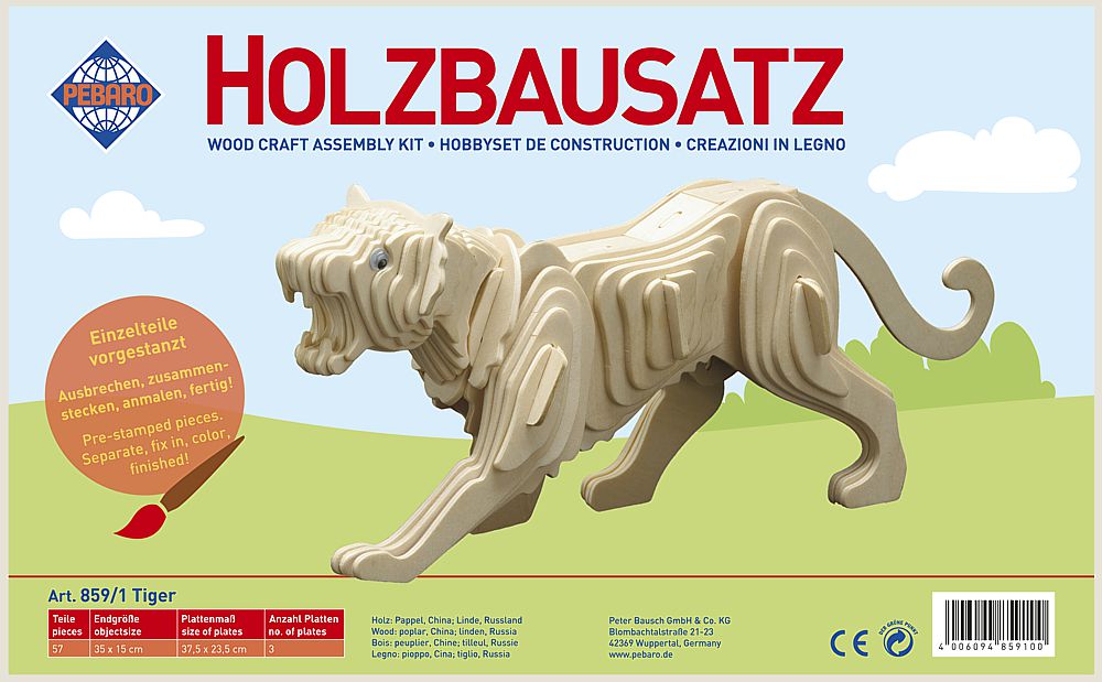 Der Bausatz Tiger besteht aus vorgestanzten Holzplatten und ist zum Stecken und Leimen geeignet. Die vorgestanzten Bauteile werden vorsichtig aus den Holzplatten herausgedrückt, bei Bedarf dabei mit einem scharfen Messer etwas nachhelfen. Anschließend alle Einzelteile mit Sandpapier entgraten, zusammenstecken und mit ein paar Tropfen Leim fixieren. Abschließend kann der Tiger nach eigenen Vorstellungen mit Farbe bemalt werden.