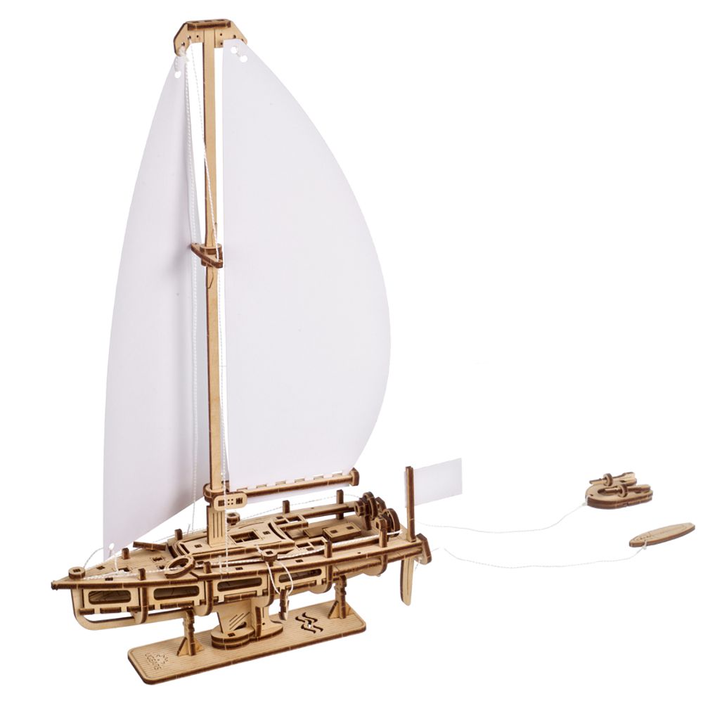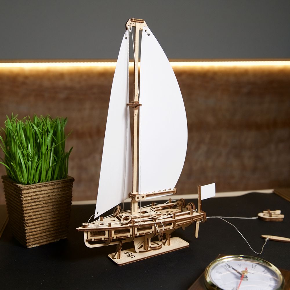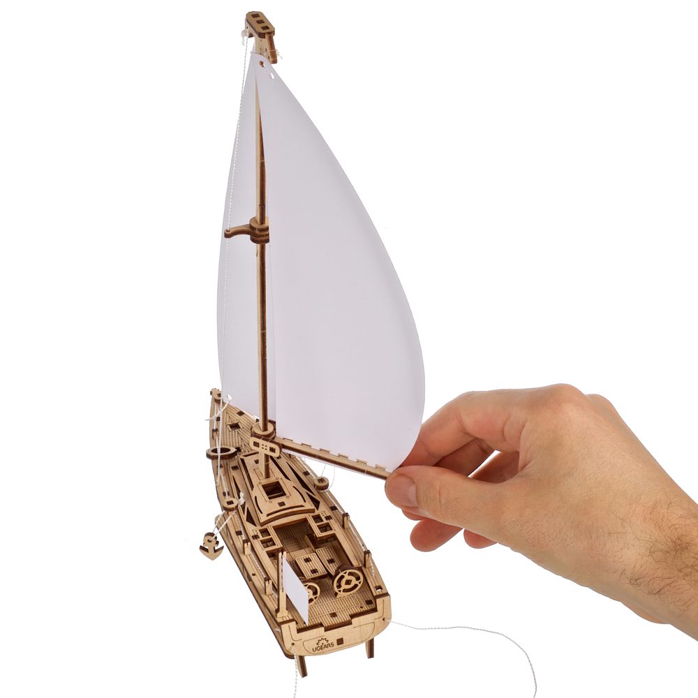 Dieses Modell unterscheidet sich ein wenig von anderen mechanischen Ugears-Modellen, denn die Jacht hat keine Zahnräder und keinen Feder- oder Gummibandmotor, der sie antreibt. Sie ist vielmehr eher als nettes Dekoelement für Zuhause oder fürs Büro gedacht.