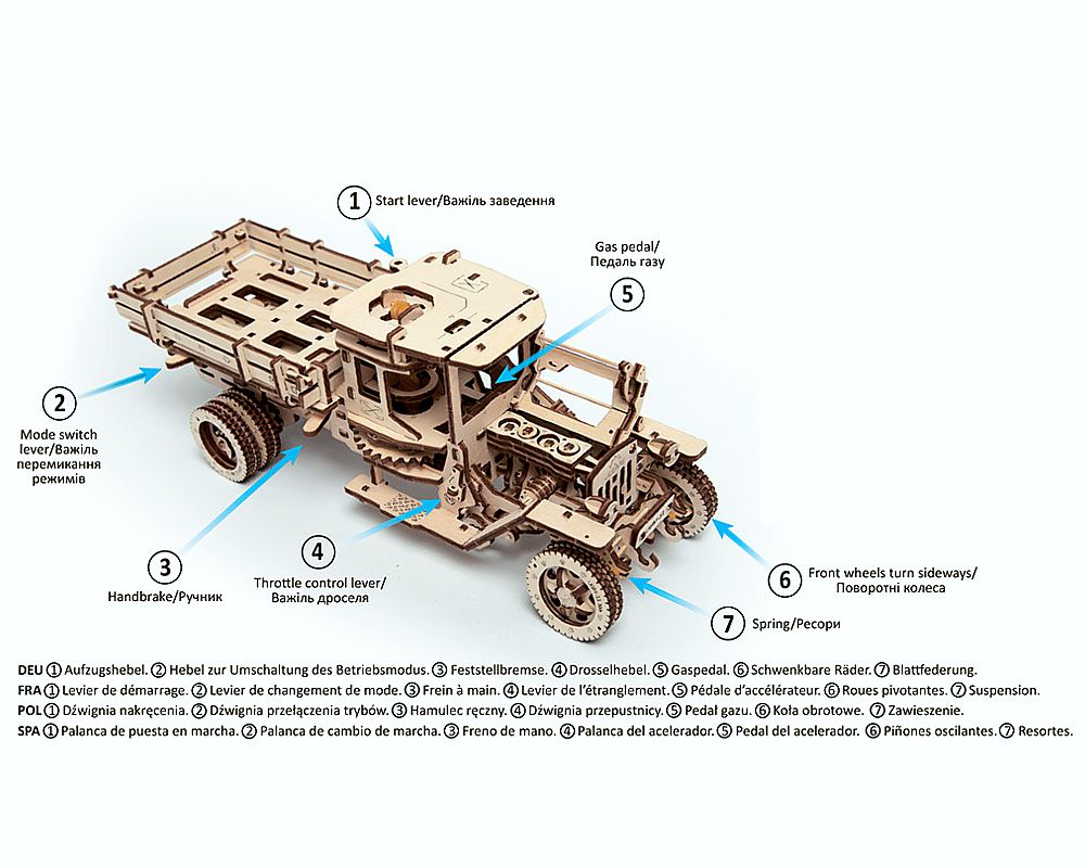 Der Holzbausatz besteht aus hochwertigem Sperrholz und ist den aus Film und Fernsehen bekannten alten Lastkraftwagen nachempfunden. Alle Bauteile sind präzise per Lasercut vorgefertigt und werden ohne Klebstoff miteinander verbaut.