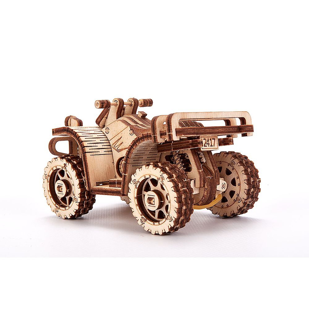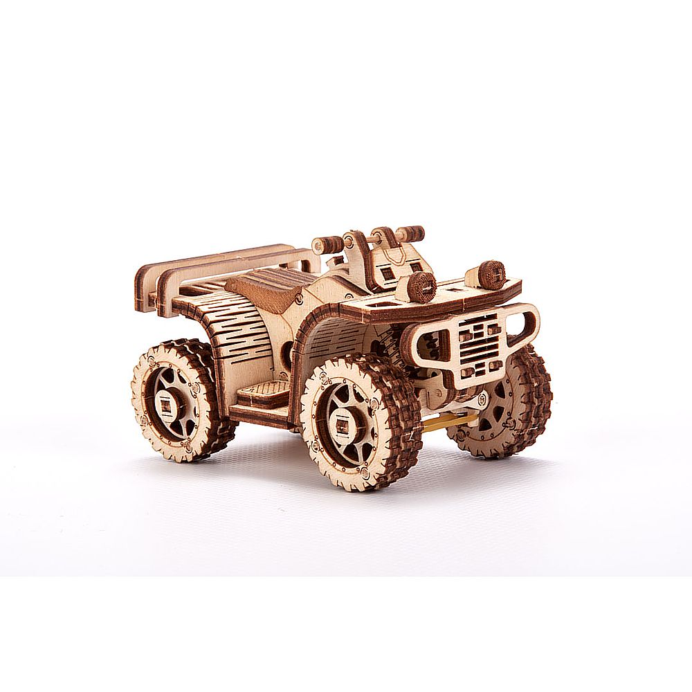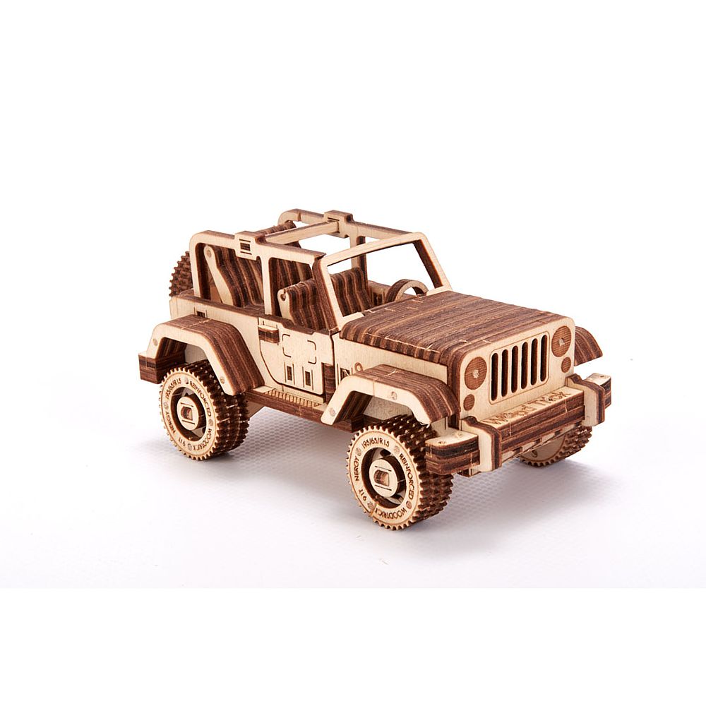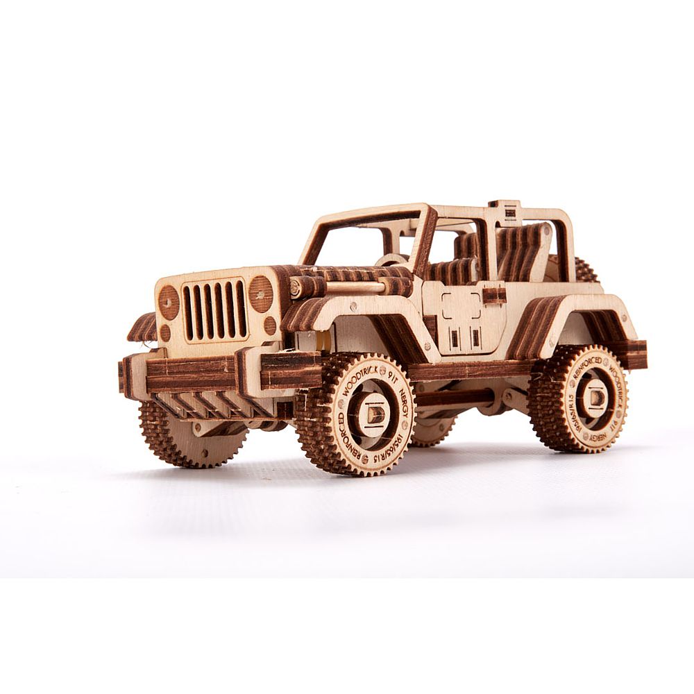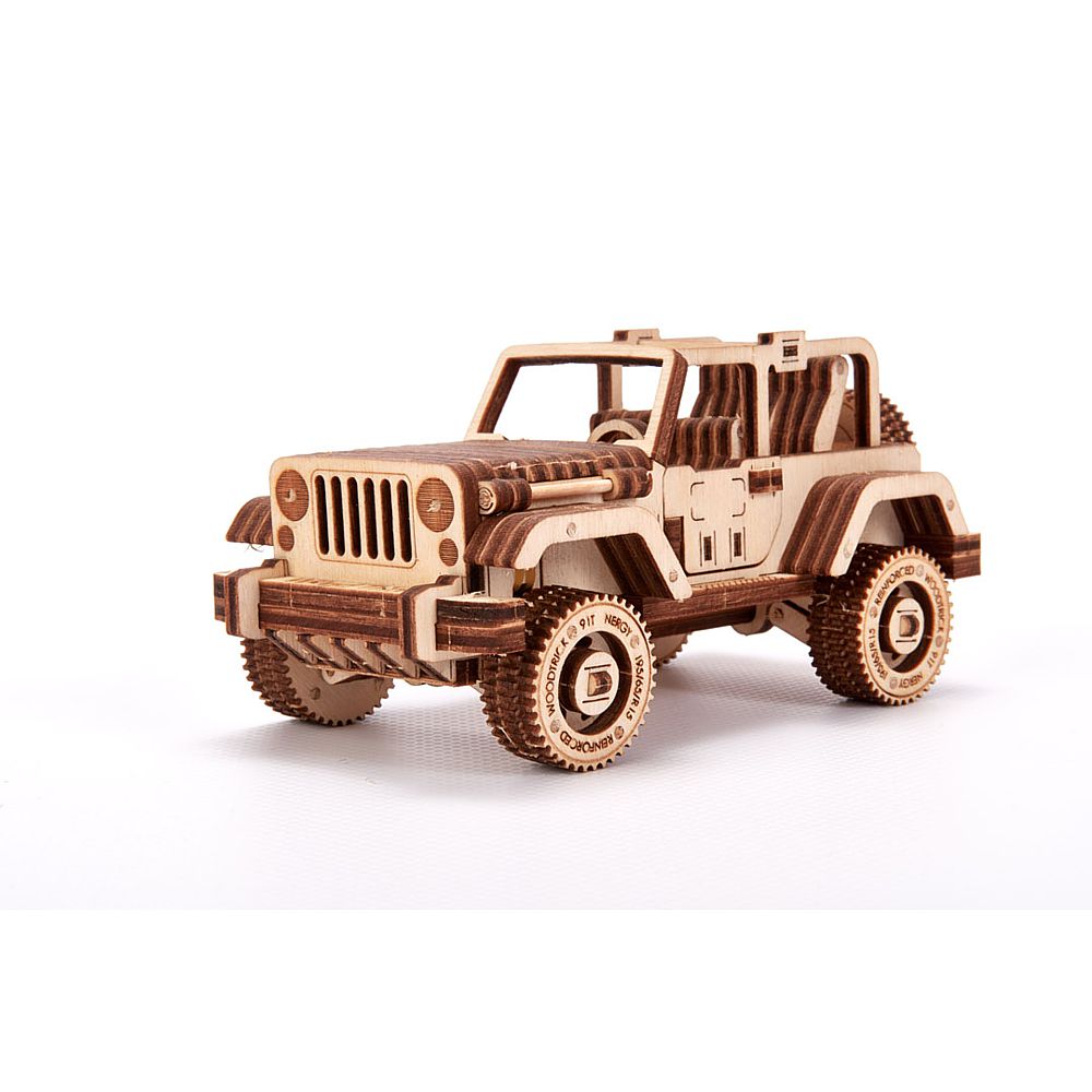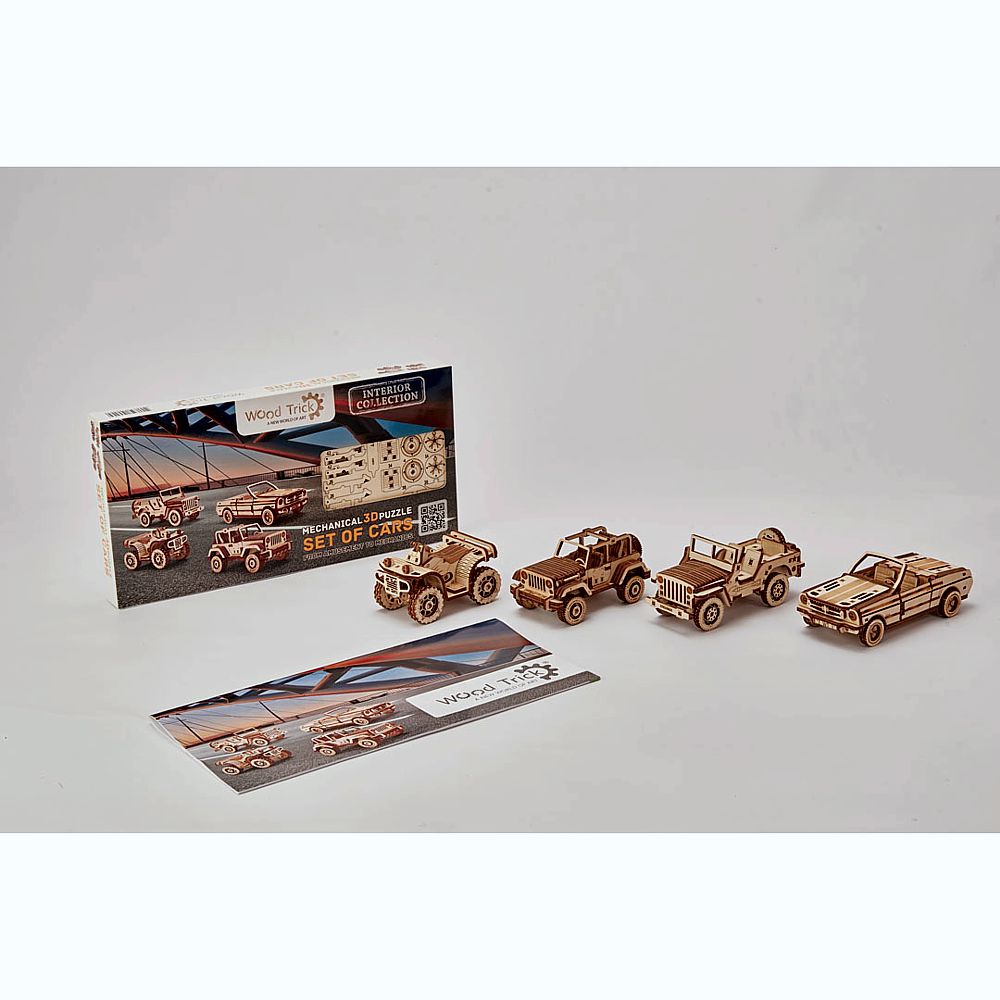 Das Set besteht aus einem Safari Jeep, einem Cabriolet, einem Quad Bike und einem Jeep, welche über diverse mechanische Funktionen verfügen. Lenkung, Federung, Motorhaube, oder Türen zum Öffnen. Die Holzbausätze von Wood Trick werden aus hochwertigen Schichtholz per Lasercut präzise vorgefertigt und werden der bebilderten Anleitung folgend, ohne Klebstoff moniert.