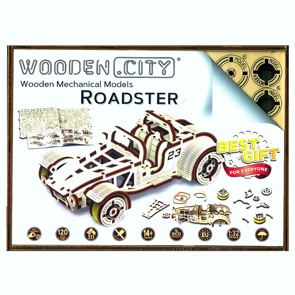 Mechanischer 3D Roadster - Holzbausatz von Wooden City, passgenau aus Birkensperrholz per Laser geschnitten. Der Zusammenbau erfolgt ohne Werkzeug und Klebstoff. Alle Bauteile werden der Anleitung folgend zusammengesteckt. Die Besonderheit der Holzbausätze von Wooden City ist die mechanische Funktion der Modelle.